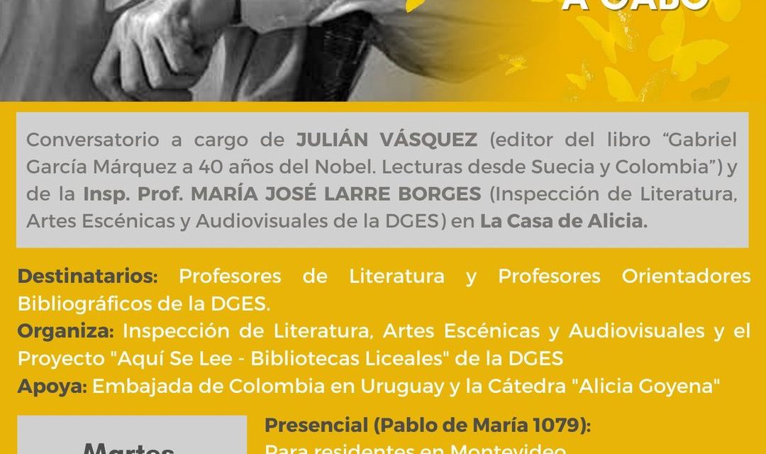 La Casa de Alicia tiene el agrado de invitarlos al conversatorio sobre Gabriel García Márquez a cargo de JULIÁN VÁSQUEZ (editor del libro “Gabriel García Márquez a 40 años del Nobel. Lecturas desde Suecia y Colombia”) y de la Insp. Prof. MARÍA JOSÉ LARRE BORGES (Inspección de Literatura, Artes Escénicas y Audiovisuales de la DGES) .