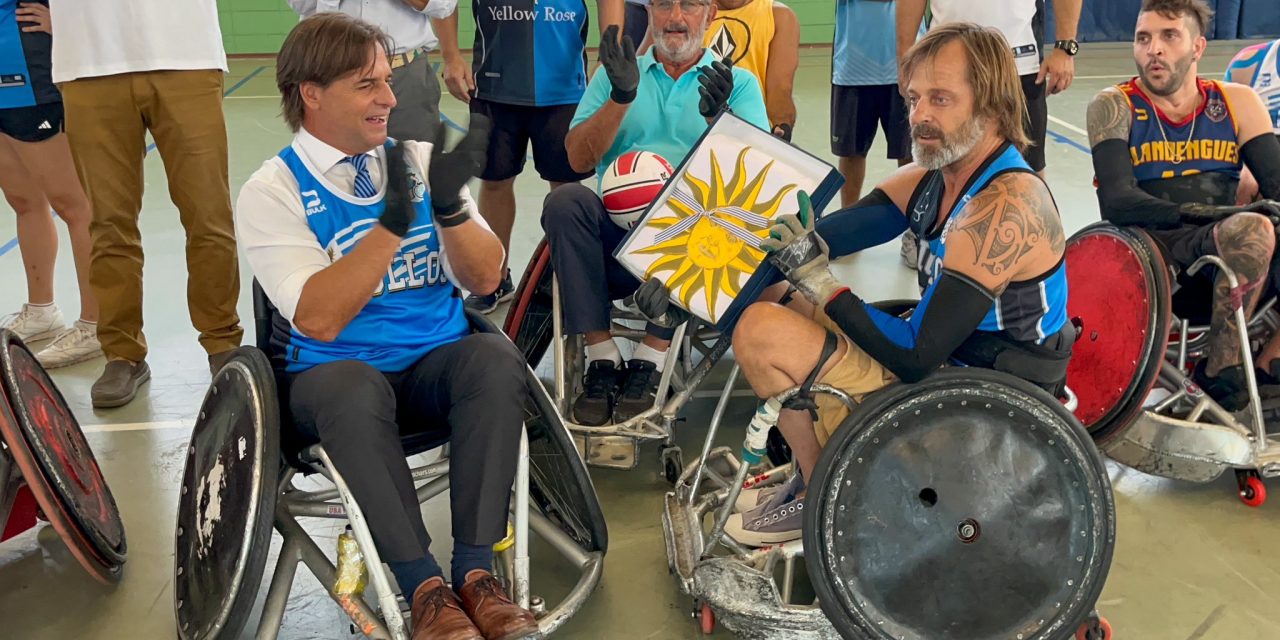 Luego de 9 años La selección de rugby en silla de ruedas viajará al Sudamericano en Brasil y el Presidente @LuisLacallePou fue invitado a participar del entrenamiento y luego hizo entrega del pabellón nacional;