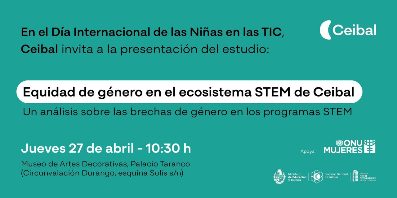 “Equidad de género en el ecosistema STEM de Ceibal” es el nombre del trabajo que presenta Ceibal, con el apoyo de ONU Mujeres, el jueves 27 de abril, a las 10:30, en el Palacio Taranco (Circunvalación Durango esq Solís, s/n.), que plantea un marco conceptual para estudiar la equidad de género en ciencia, tecnología, ingeniería y matemática (STEM) en la infancia y la adolescencia.