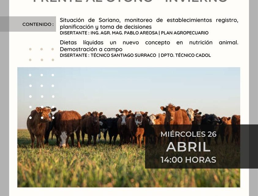 El miércoles 26 de abril a las 14 horas en el departamento de Soriano se llevará a cabo la Jornada “Alternativas de manejo en los sistemas ganaderos” en la Escuela Agraria «La Concordia» de UTU.