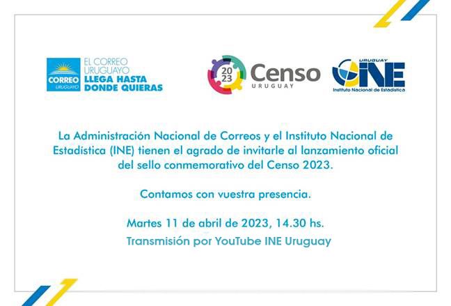 Lanzamiento del sello del Censo 2023 Abr 10, 2023 | Asociaciones y Otros, Destacados | 0 | Junto al Correo Uruguayo el Instituto Nacional de Estadística (INE) este martes 11 de abril lanza el sello del Censo 2023. Martes 11 de abril. 14:30 horas. Seguí la transmisión en vivo por el canal de YouTube INE Uruguay