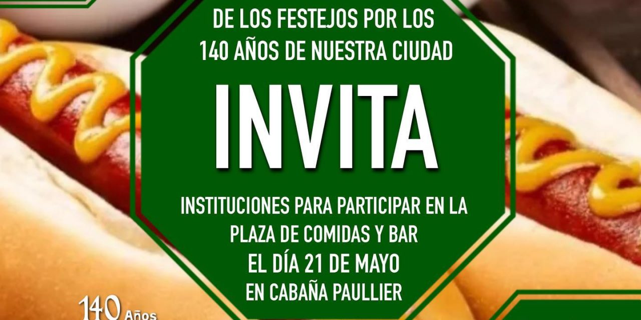 Con motivo del aniversario Nº 140 de nuestra ciudad, los integrantes de la Coordinadora de Cultura de los Festejos invitan a instituciones de la 5ta sección para participar en la plaza de comidas y bar que se realizará en Cabaña Paullier.