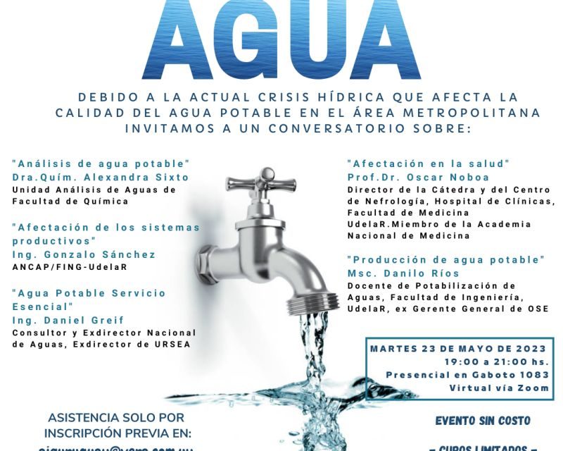 Debido a la actual crisis hídrica que afecta la calidad del agua potable en el área Metropolitana de Uruguay, la Asociación de Ingenieros Químicos del Uruguay invita a un Conversatorio el día martes 23 de mayo de 2023 de 19:00 a 21:00 horas.