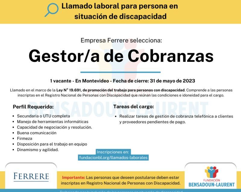 Llamado en el marco de la Ley N° 19.691, de promoción del trabajo para personas con discapacidad. Comprende a las personas inscriptas en el Registro Nacional de Personas con Discapacidad que reúnan las condiciones e idoneidad para el cargo.