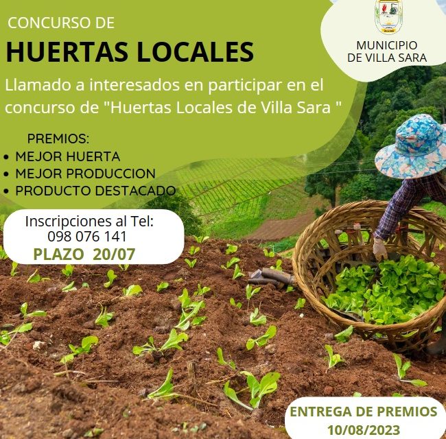 Concurso de “Huertas Locales de Villa Sara” Jul 16, 2023 | Ambiente, Barriales, Destacados | 0 | Llamado a interesados en participar en el concurso de “Huertas Locales de Villa Sara” en el departamento de Treinta y Tres. Inscripciones al Tel: 098 076 141. PLAZO: HASTA EL 20 DE JULIO DE 2023. ENTREGA DE PREMIOS: 10 DE AGOSTO DE 2023.
