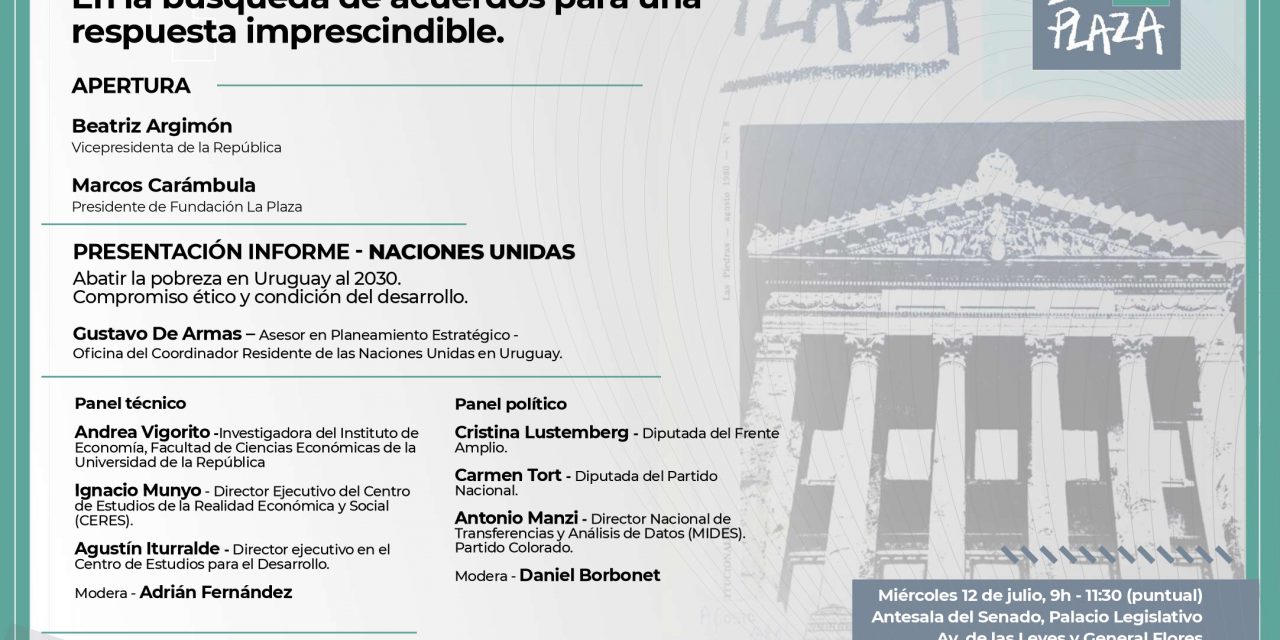 Será este miércoles 12 de julio de 9 a 11:30 horas en la antesala del Senado, Palacio Legislativo – Av de las Leyes y General Flores – bajo la organización de Fundación La Plaza, en la búsqueda de acuerdos para una respuesta imprescindible, con el objetivo de colocar un tema clave en el centro de la agenda pública.