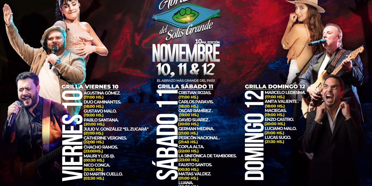 Abrazo del Solís Grande: Una grilla de artistas para todos los gustos Nov 6, 2023 | Barriales, Destacados, Entretenimiento | 0 | Les presentamos la grilla de artistas para este importante evento. Será un gusto recibirlos en esta décima edición. Abrazo del Solís Grande 2023! 10, 11 & 12 de noviembre. ¿Dónde? Ruta 9, kilómetro 81