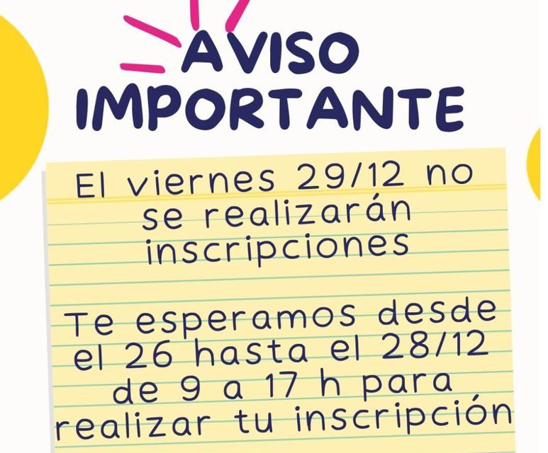 Se puntualiza en particular que el viernes 29 de diciembre no se llevarán a cabo Inscripciones.
