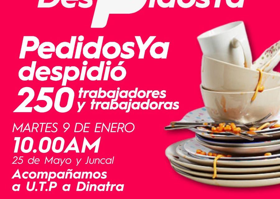 Movilización por despidos en PedidosYa Ene 8, 2024 | Asociaciones y Otros, Destacados, Sindicatos | 0 | Este martes 9 de enero, FUECYS realizará una movilización en respaldo a los más de 200 trabajadores despidos por Pedidos Ya. Será a partir de la hora 10 en 25 de Mayo y Juncal (a metros del Ministerio de Trabajo y Seguridad Social – MTSS).