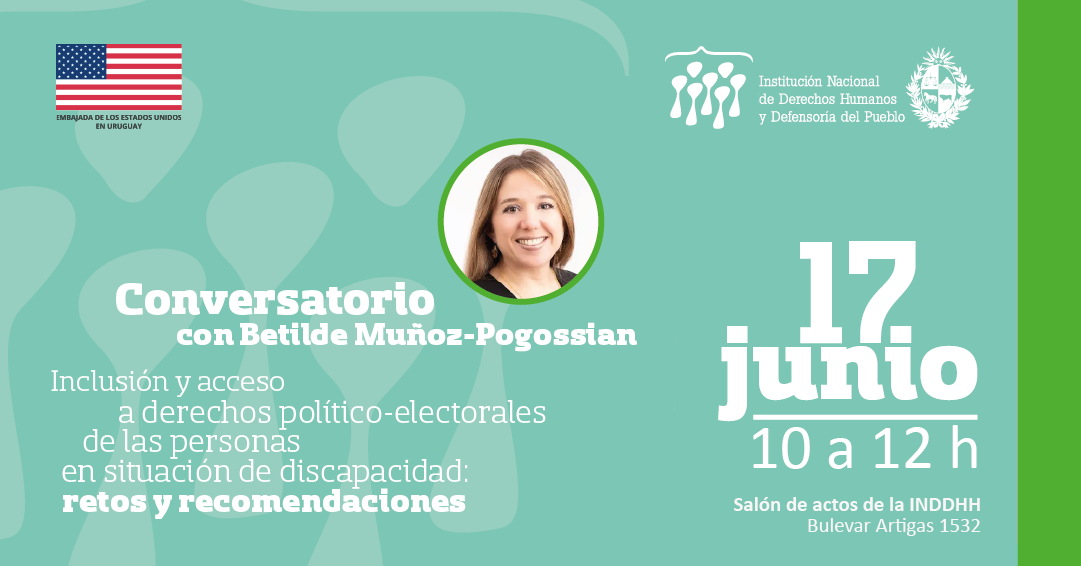 La Institución Nacional de Derechos Humanos y Defensoría del Pueblo junto con la Embajada de Estados Unidos en Uruguay invitan al conversatorio Inclusión y acceso a derechos político-electorales de las personas en situación de discapacidad: retos y recomendaciones.