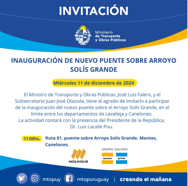 La actividad contará con la presencia del Presidente de la República, Luis Lacalle Pou, el ministro de Transporte y Obras Públicas, José Luis Falero, y el subsecretario del MTOP, Juan José Olaizola.