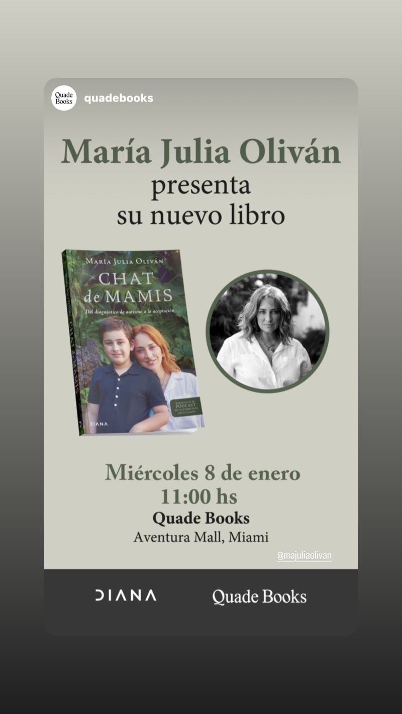 Este miércoles 8 de enero de 2025, la periodista argentina María Julia Oliván, presentará su libro “Chat de mamis”, una mirada con amor de madres y con aportes profesionales sobre cómo abordar y vivir la vida junto a hijos que están diagnosticados con el Trastorno del Espectro Autista (TEA).