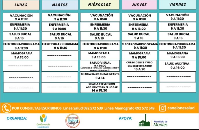 Entre los servicios disponibles se incluyen: vacunación (esquema regular, gripe y COVID), test rápidos de anemia, VIH, sífilis y control de glicemia, control de presión arterial, salud bucal (arreglos, extracciones y limpieza de sarro), salud visual, salud auditiva, Papanicolau, mamografía, electrocardiograma, consulta psicológica, Salud en tu barrio y técnica odontológica PRAT (sellantes). Además, se realizan charlas (odontología infantil) y cursos educativos sobre salud, tales como primeros auxilios, RCB, uso del DEA y prevención de accidentes en el hogar.