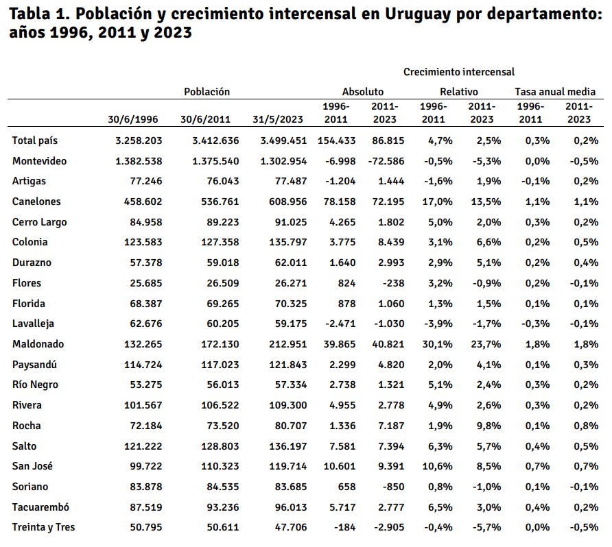 Población total de Uruguay en 2023 y crecimiento intercensal (2011-2023).