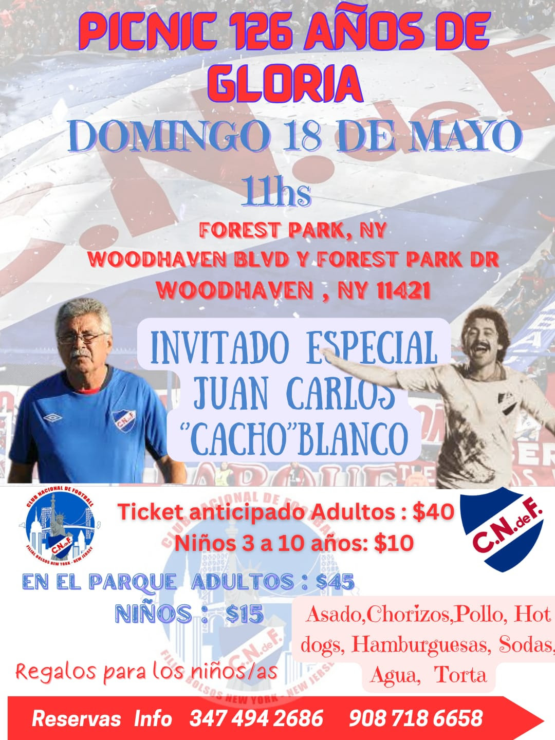 El Consulado General del Uruguay en Nueva York compartió la invitación al Picnic de celebración de los 126 años del Club Nacional de Fútbol organizado por Filial Bolsos NY-NJ junto al invitado especial Juan Carlos «Cacho» Blanco.