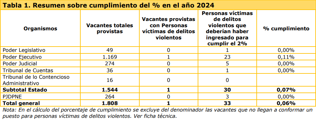 “Si tenemos en cuenta aquellos organismos que ocuparon vacantes suficientes para al menos realizar un ingreso, alcanzar el cupo del 2% de las vacantes a ser cubiertas en el año hubiera representado el ingreso de 33 personas víctimas de delitos violentos. Fueron 47 los organismos (7 organismos del Estado y 40 Personas Jurídicas de Derecho Público no Estatal) cuyas vacantes provistas no fueron suficientes para realizar ingresos de personas con víctimas de delitos violentos en 2024, por lo tanto, se considera que cumplen con el art. 105 de la Ley Nº 19.889”, se agrega.