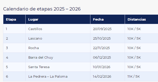 Con tu inscripción accedés a todas las 6 etapas del evento, incluyendo la clásica La Paloma – La Pedrera, y además te llevás la remera oficial de “Rocha Corre 2025-2026”.